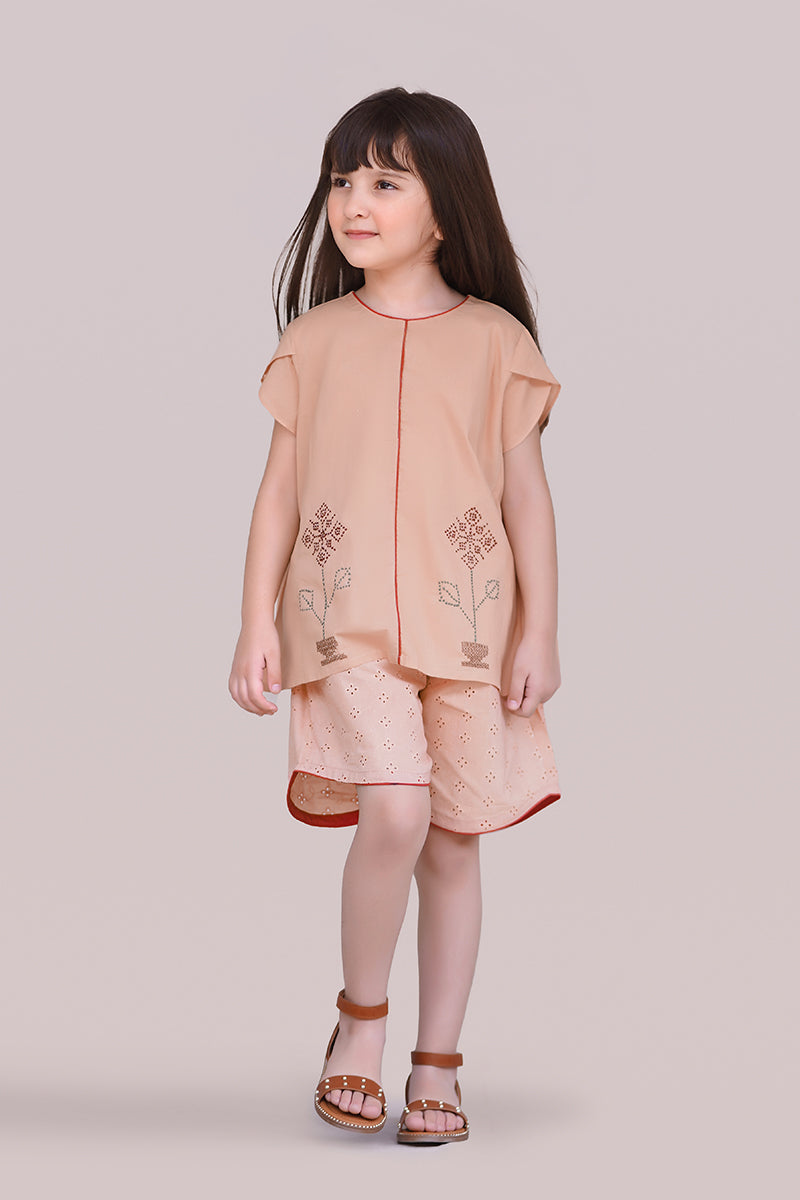 Charming red piping along the bodice and flap-style sleeves gives it a pop of color and playful detail. The set is perfectly paired with Chikan Kari shorts, also trimmed with matching red piping — making it both stylish and easy to move in.
