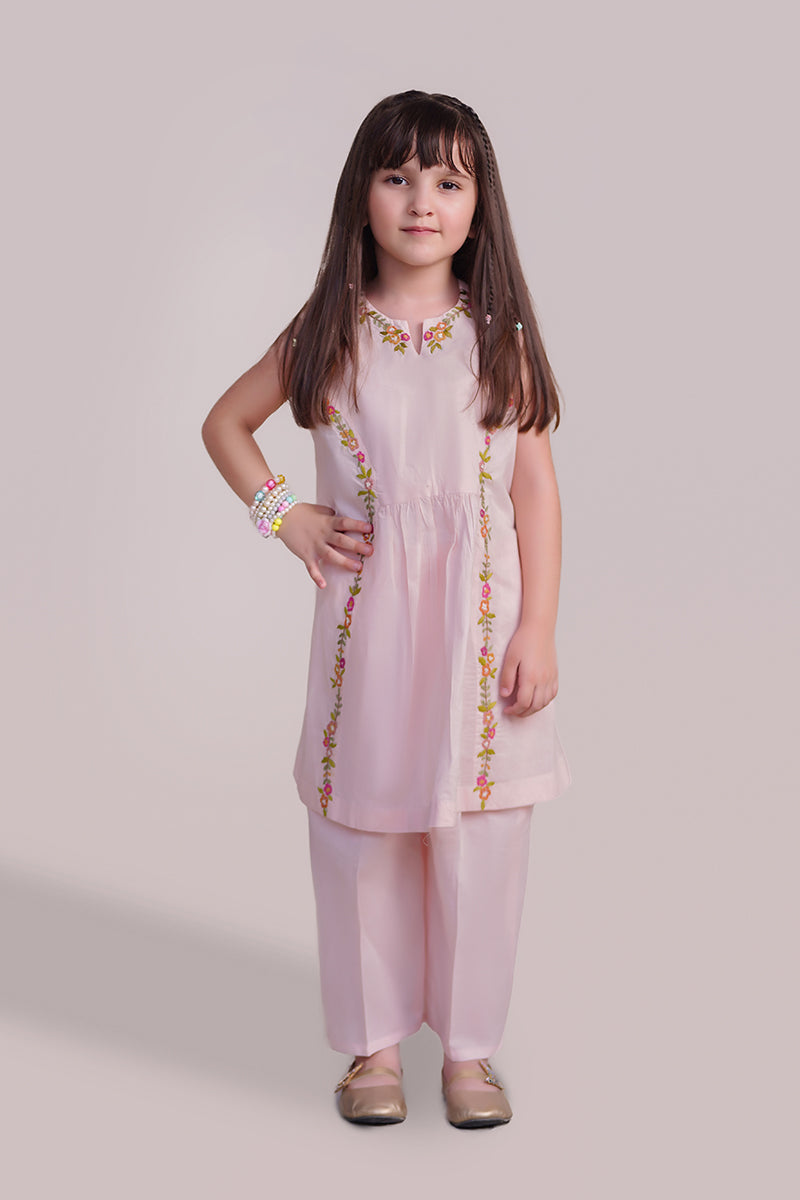 Sweet, soft, and stitched with love — this light pink panel-style frock is a graceful addition to your little one’s wardrobe. Thoughtfully designed with delicate pleats down the center, it features intricate embroidery along the neckline and both sides of the panel, creating an elegant, hand-finished look.